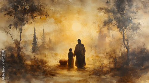 holy, family, watercolor, scene, tranquil, muted, earth, tone, colours, withering, serene, atmosphere, manger, divine, subtile, peaceful, gentle, harmony, softness, beauty, light, warmth, love, joy, simplicity, art, nature, spirituality, innocence, faith, compassion, grace, tenderness, quiet, background, emotion, oneness, landscape, imagery, stillness, tradition, reverence, purity, inspiration, calmness