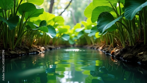 beauty, tranquil, waterway, natural, garden, still, duck pond, edge, lush, leaf, foliage, vibrant, high-coloured, plant, peaceful, green, nature, sparkling, daylight, serene, water, close, calm, canal, fresh, flora, fresh water, flowing, detail, shallow, texture