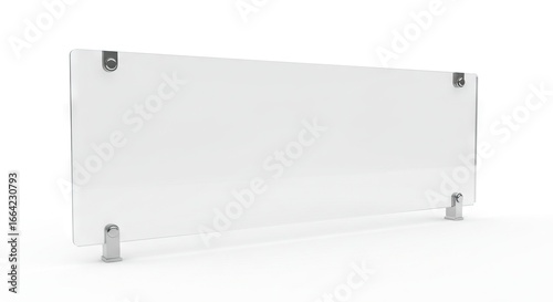 partition, acrylic, divider, transparent, clear, barrier, desk, office, workplace, workstation, cubicle, screen, safety, health, hygiene, separation, metal, fitting, racked, foot, support, fixture, fastener, bolt, screw, round, square, bracket, connection, panel, protective, shielding, isolated, object, furniture, equipment, modern, indoor, interior, design, presentation, blank, empty, space, studio, shot, clean