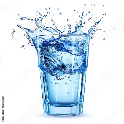 A transparent glass with vibrant blue water splashing inside