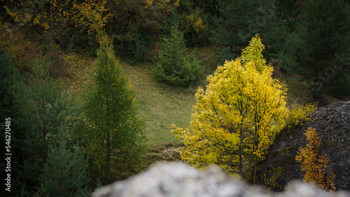 A tree with yellow and golden leaves, isolated in a forest of fir trees, next to a large rock in the mountains. Fall season.