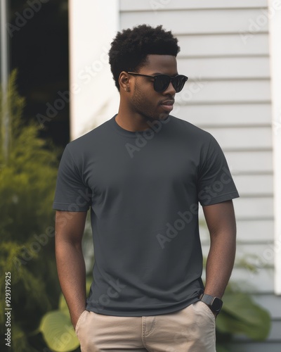 afro, black, male, casual attire, fashion, confidence, stylish, summer, model, sunlight, standing, relaxed, sunglasses, greenery, solo, trendy, simple, urban, youthful, minimalist, portrait, pose, natural, light, wear, aesthetic, attire, neck, style, warm, weather, comfortable, fashionable, nonchalant, modern, leisure, self-assured, chic, effortless, serene, tee, template, production, asset, man