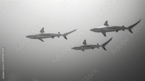 A trio of sharks swim gracefully in a grey underwater expanse, their streamlined bodies moving effortlessly through the tranquil waters.