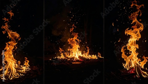 A triptych of vibrant fire flames against a dark backdrop