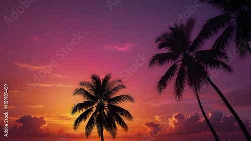 A tropical sunset scene with intense orange, pink, and purple gradients