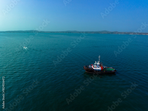 A tugboat navigates the expansive blue sea under a clear sky, with distant hills on the horizon. Cartagena, Colombia