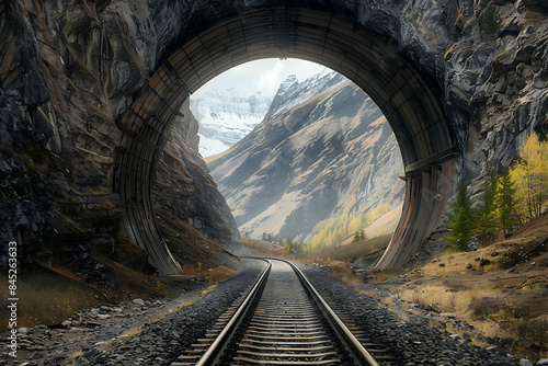 A tunnel cuts through the mountains, with a new road or railway tracks illustrating the combination of natural beauty and human engineering, symbolizing exploration and communication