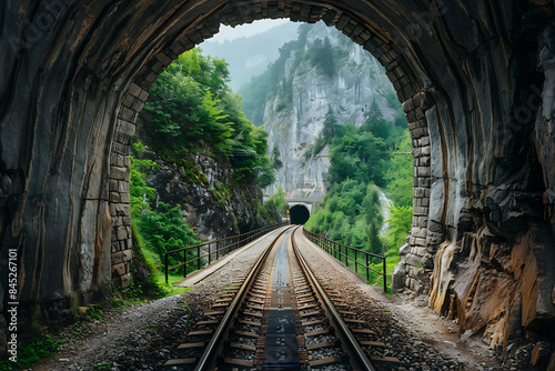 A tunnel cuts through the mountains, with a new road or railway tracks illustrating the combination of natural beauty and human engineering, symbolizing exploration and communication