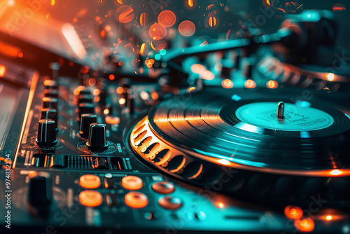 A turntable with a record on it and a mixer with a bunch of knobs