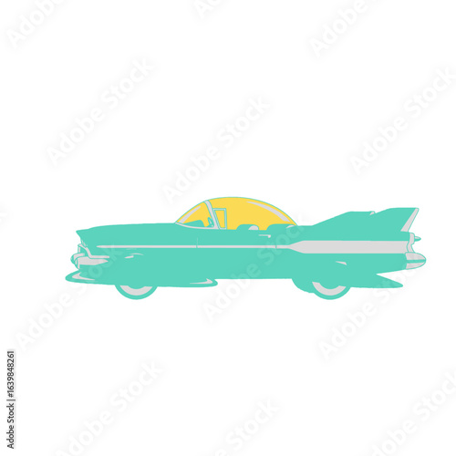 A turquoise vintage convertible car with a yellow canopy and white racing stripes.