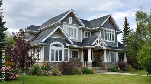 property, home, tree, colourful, colours, style, white, trim, exterior, grey, roof, two-story, design, architecture, house, greenery, 2, story, surrounded, tree