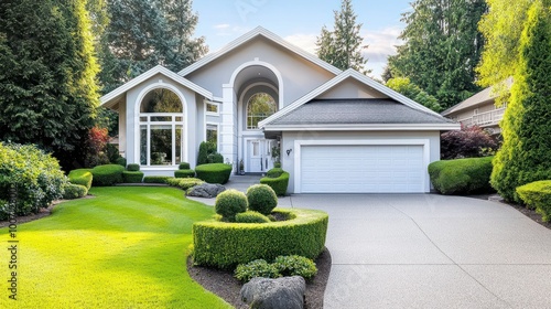 A two-story suburban home with a large driveway, garage, and neatly trimmed bushes lining the pathway to the front door.