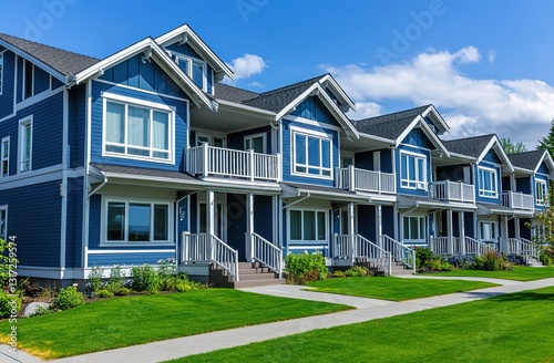 house, row, modern, home, exterior, blue, siding, window, door, step, lawn, neighbourhood, residential, architecture, design, real estate, property, housing, suburban, american, style, investment, living, community, family, lifestyle