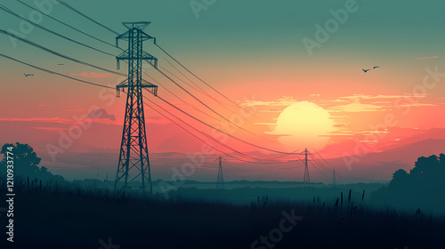 A uk standard electric pylon at sunset. Electric Fields. Illustration