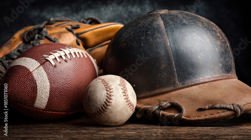 A used baseball, football, glove, and helmet sit together on a rustic wooden surface creating a vintage and well worn sports equipment still life composition.