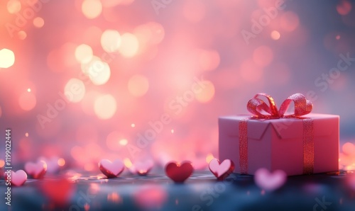 A Valentine's Day banner featuring a present box and hearts. The design has a romantic background with selective focus and a blurred backdrop.