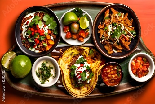 A variety of dishes on a ONE PLATE. Restaurant serving. Top view. mexican food