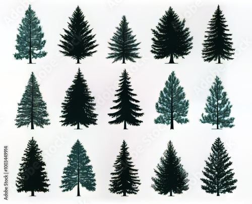 A variety of evergreen trees displayed in multiple silhouettes and styles.