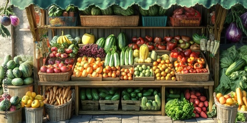 fruit, vegetable, racked, market, produce, fresh, food, farm, stall, organic, healthy, natural, green, red, yellow, display, wooden, rustic, harvest, ripe, vibrant, colourful, abundant, grocery, local, summer, garden, country, bounty, basket
