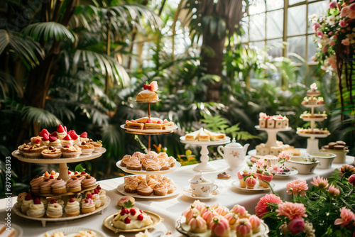 A variety of pastries and desserts elegantly displayed on different levels of stands amidst a lush greenhouse setting with abundant green plants