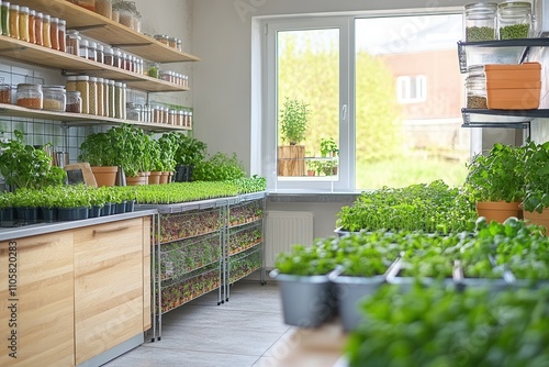 herb, garden, kitchen, interior, spring, plant, gardening, fresh, herb, growth, container, sunshine, organic, greenery, nurturing, home, pot, indoor, vegetable, basil, parsley, mint, cilantro, thyme, rosemary, light, sustainable, food, indoor, houseplant, nature, environment, produce, healthy, living, urban, edible, dirtied, watering, cultivation, shelf, cabinet, jar