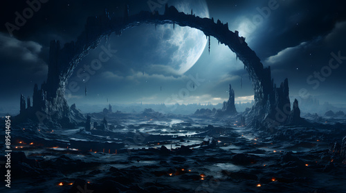 A vast, alien landscape with towering rock formations and a moon in the sky above, with a mysterious arch in the foreground.