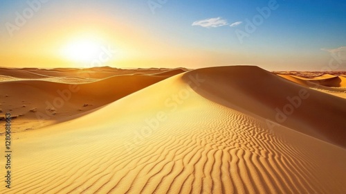 A vast and untouched desert with bright sand dunes glowing under the sun.