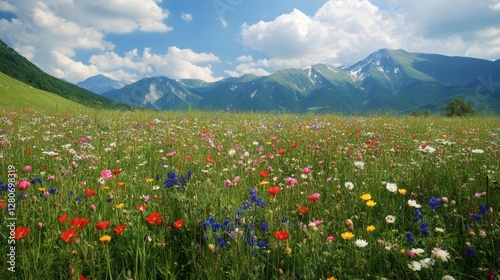 A vast, open meadow filled with vibrant flowers, nestled between Eastern European mountains.