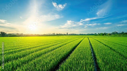 A vast rice paddy field with rows of green plants neatly organized, extending far into the distance, under a bright, sunny sky with a few wispy clouds