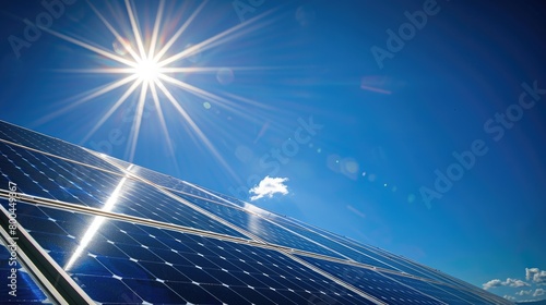A vast solar power station with rows of blue panels gleams in the sunlight