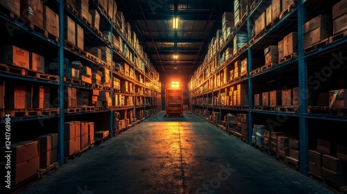 A vast, well-organized warehouse features racks of boxes and shelves filled with inventory reaching up to the ceiling, exuding a sleek, modern industrial look