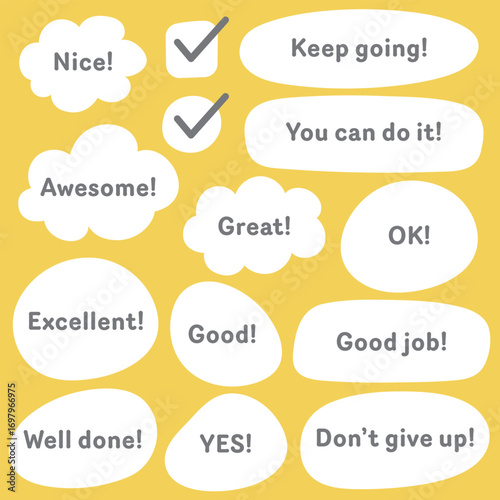 motivation, message, bubble, note, label, frame, quote, sticker, hand-drawn, phrase, encouragement, cheer up, speech, cloud, circle, rounded, rectangle, casual attire, positive, pastel, cute, yellow, layout, fun, good job, awesome, excellent, great, graphic, vector, illustration