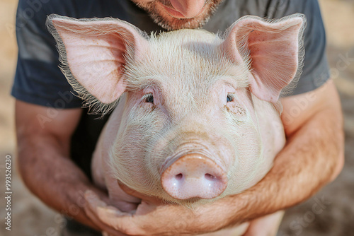 vegan, man, embracing, pig, farm, heartfelt, moment, animal, care, connection, affection, activism, nurturing, love, interaction, warmth, emotional, bond, peaceful, environment, companionship, touch, comfort, visual, expression, harmony, trust, nature, calmness, gentle, atmosphere, intimacy, kindness, understanding, commitment, welfare, compassion