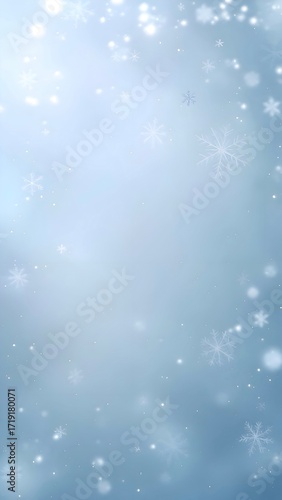 A vertical, abstract light blue background featuring soft light rays, bokeh effects, and detailed snowflakes framing the edges. Clean winter backdrop