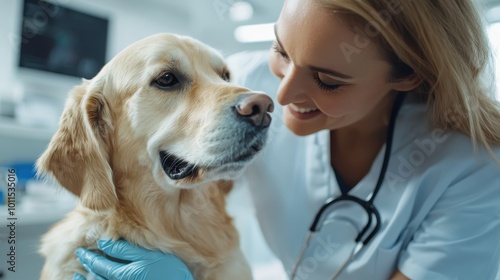 A veterinary nurse caresses a lovely retriever in a bright, modern animal care facility, highlighting the compassionate treatment and positive environment for pets.