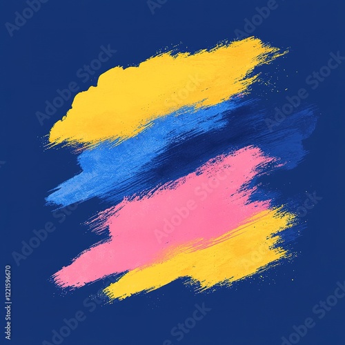 A vibrant abstract design featuring bold strokes of yellow, pink, and blue against a deep blue background.