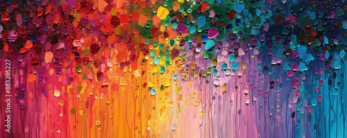 A vibrant abstract painting with layers of rich colors, creating a dynamic patterns reminiscent of flowers or leaves.