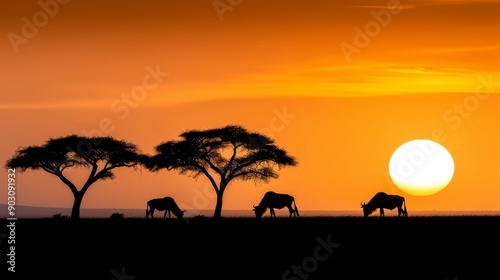A vibrant African savanna during the golden hour, with grazing wildlife and acacia trees silhouetted against the sunset, with copy space, high-resolution photo, realistic photo
