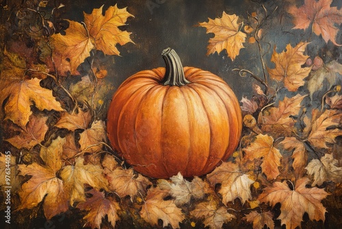 A vibrant and bright pumpkin is nestled among colorful autumn leaves, perfectly capturing seasonal beauty and charm