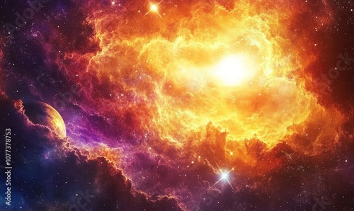 A vibrant and colorful nebula with swirling clouds of gas and dust, shining stars, a blazing sun, and a planet in the foreground