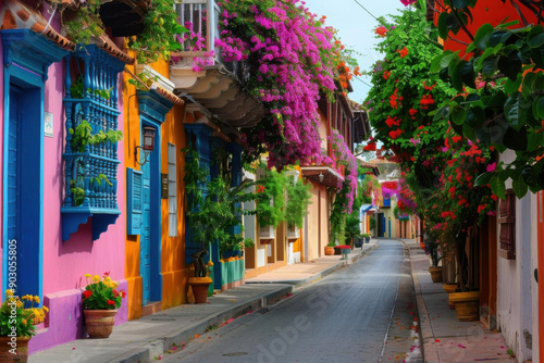 A vibrant and colorful street in Cartagena, Colombia, with colonial architecture and blooming bougainvillea
