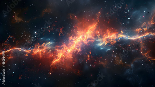 A vibrant and detailed depiction of a nebula with orange and blue hues against a starlit background