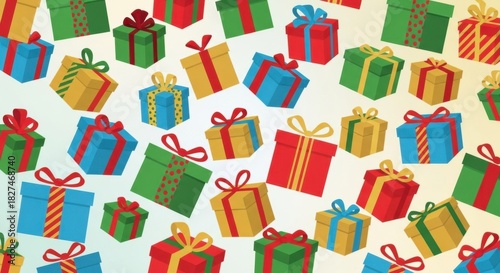 A vibrant and festive collection of colorful gift boxes with red ribbons creating a joyful holiday and celebration background pattern