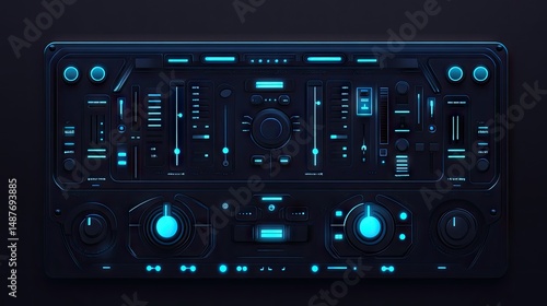 A vibrant and futuristic digital audio mixer featuring illuminated controls and a sleek design. set against a dark backdrop. ideal for music production and DJing visuals