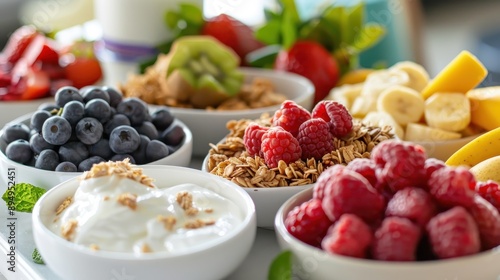 A vibrant and healthy breakfast spread with fresh fruits, yogurt, and granola in white bowls on a wooden table.