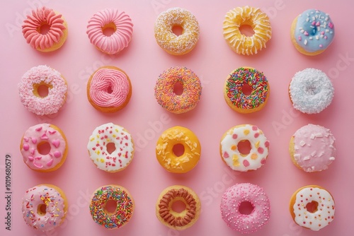 A vibrant and visually appealing arrangement of colorful, freshly baked donuts on a plain pink background, showcasing a delightful assortment of sweet treats.