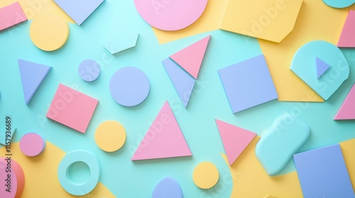 A vibrant arrangement of pastel geometric shapes on a bright background, showcasing symmetry and creativity. Perfect for design, teaching, and artistic concepts.