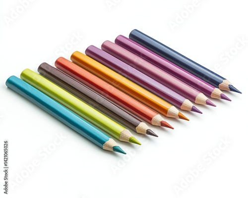 A vibrant array of colored pencils arranged in a diagonal line on a clean, white background, showcasing their vivid hues and sharpened tips, ideal for artistic projects or educational use