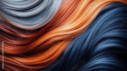 A vibrant array of flowing hair strands in shades of orange, blue, and silver, creating a dynamic and colorful composition.
