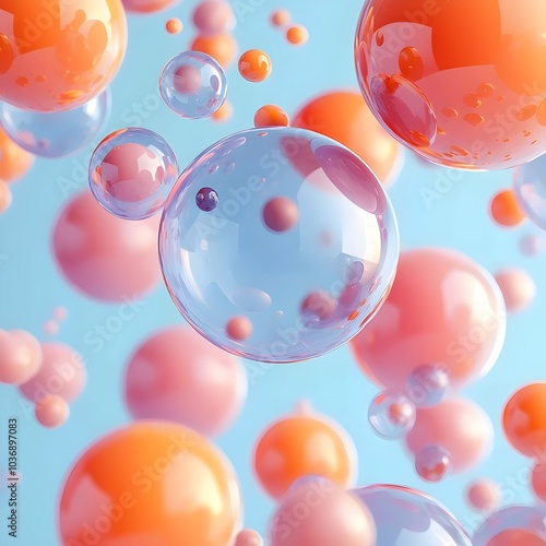 A vibrant array of translucent bubbles in shades of orange and pink floating against a soft blue background, creating a playful and dreamy atmosphere.